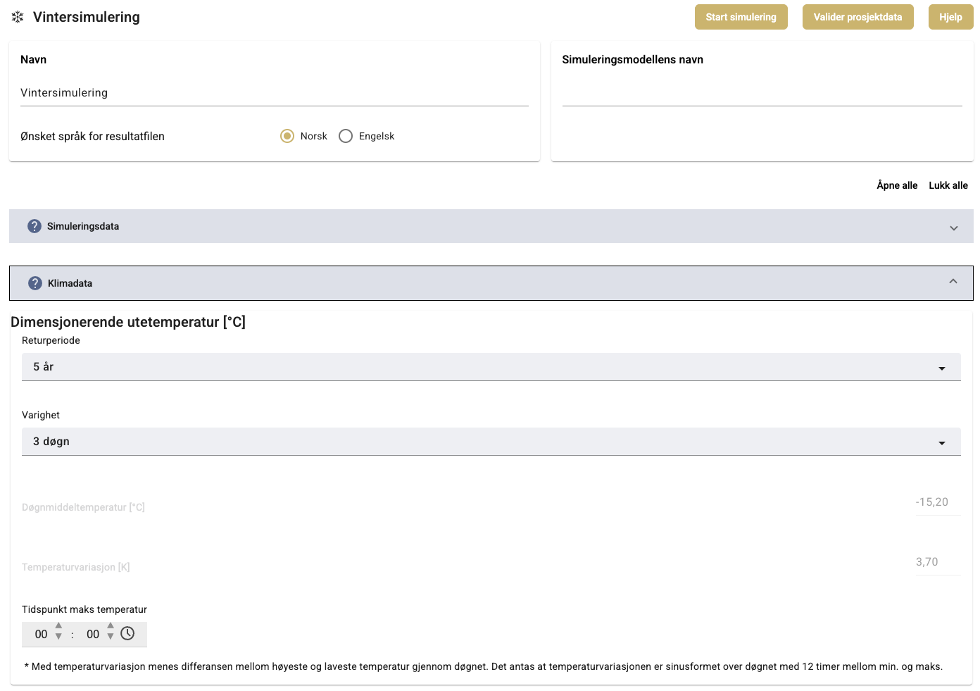 Returperiode og varighet velger du nå fra nedtrekksmenyen. Her vintersimulering