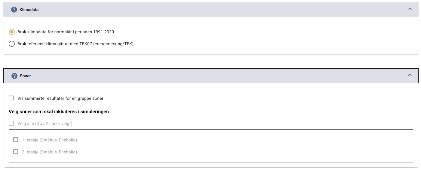 Også under Årssimulering er det kommet nye klimadata for ny klimaperiode. Det er også lagt inn en knapp for å kunne simulere med det gamle referanseklimaet som ble gitt ut med TEK07 og den gamle energimerkeordningen. Valg av soner som skal være med i simuleringen er også et nytt element.