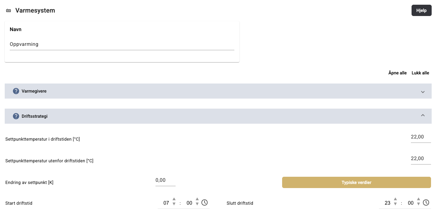 Som hjelp for å sette riktig temperaturen kan du velge fra listen over Typiske verdier.  Disse verdiene forteller hva som er typisk å ha som tillegg til settpunkttemperatur basert på hvilken type løsning du har valgt. Verdiene er basert på metode og data beskrevet i vedlegg D i NS 3031:2025.