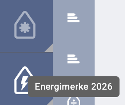 I menyen for simuleringer i Simien PRO er det to energimerke-symboler. Dra musepekeren over og velg den som er merket «Energimerke 2026». Da kommer du til det nye energimerkeelementet, som nå har fått flere nye felter, som: