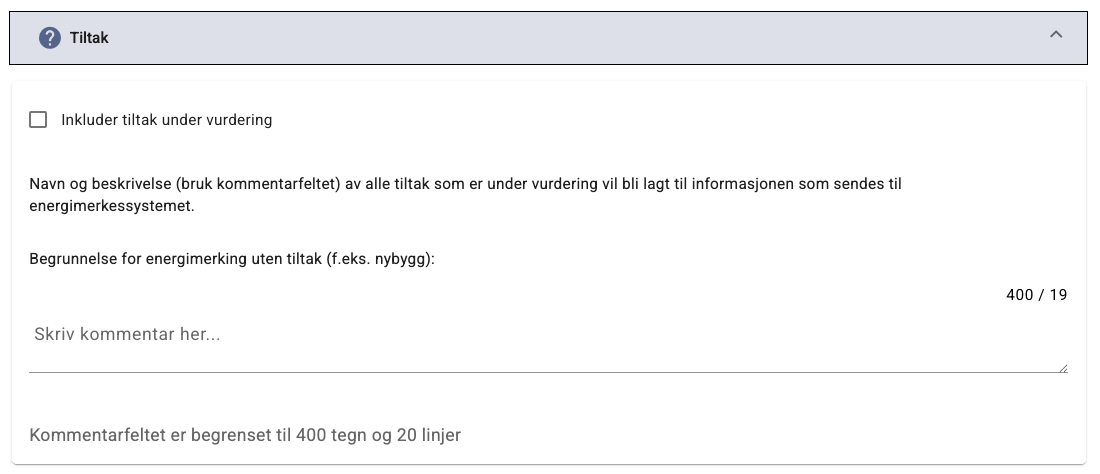 Alle bygg som selges eller leies ut skal ha en energiattest med både energimerke og liste over forbedringstiltak. Eventuelle tiltak som er flyttet til aksepterte tiltak allerede, tas med i modellen. Her legger du til tiltak som er under vurdering.