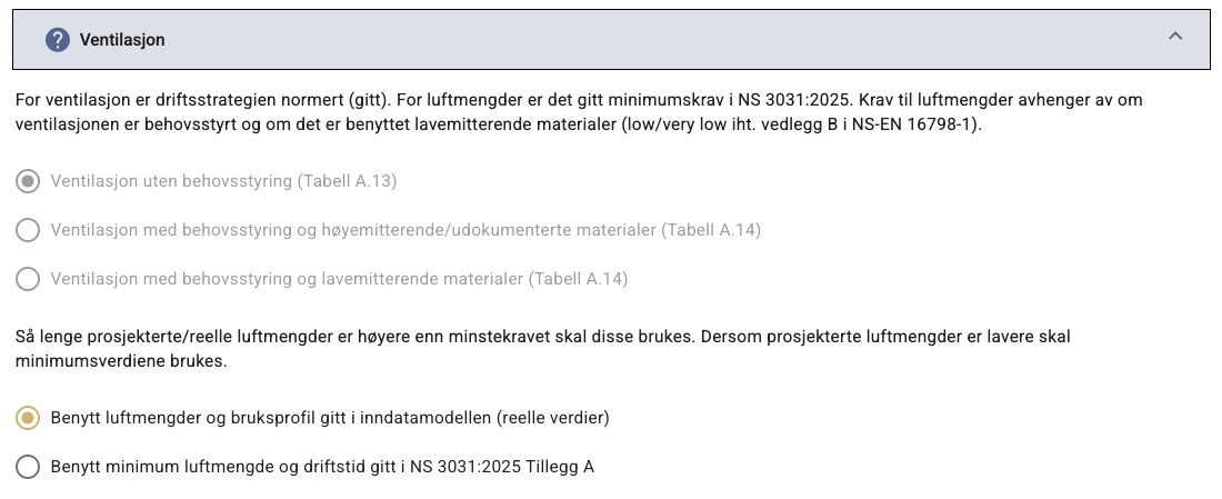 Er prosjekterte/reelle luftmengder høyere enn minstekravet skal disse brukes. Er luftmengdene lavere skal minimumsverdiene gitt i tillegg A til NS 3031:2025 brukes.